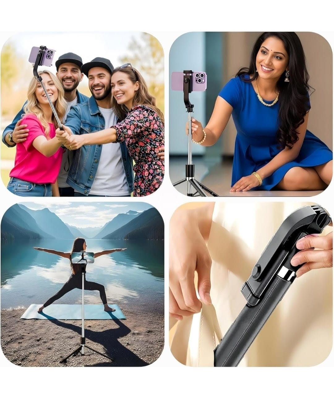 The wireless Bluetooth remote lets you click photos from a distance without touching your phone—perfect for selfies and solo shoots. Its lightweight and foldable design makes it travel-friendly and easy to carry in a bag or backpack.